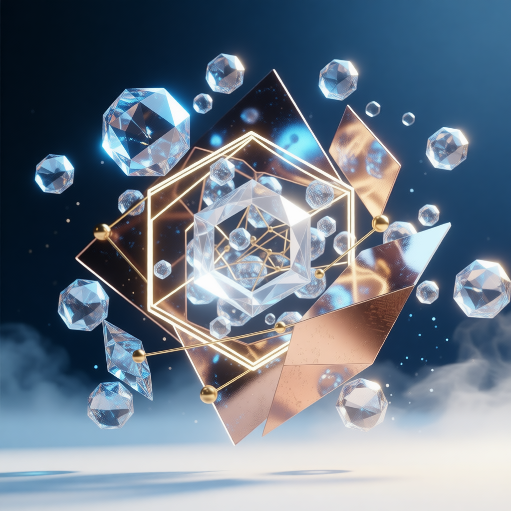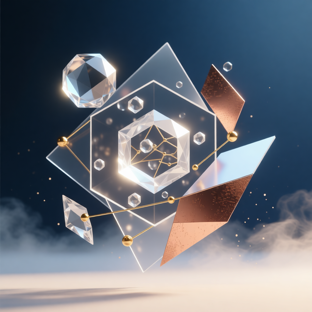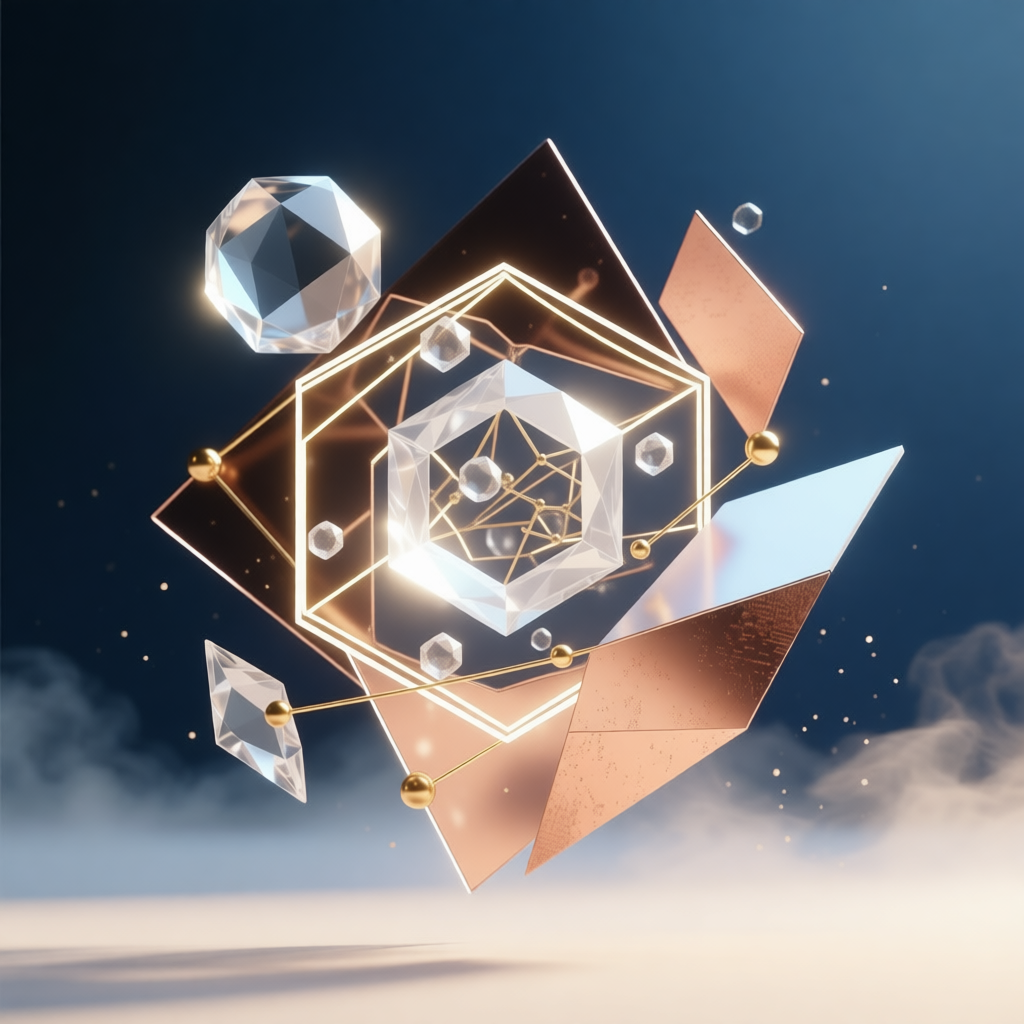 Abstract visual interpretation inspired by post-digital materiality, Tuscan light harmony, and psychoacoustic resonance. Evoke translucent geometric fragments suspended in luminous vapor, with subtle golden nodes and soft algorithmic glow. Use a restrained palette of deep midnight blue, warm ivory, oxidized copper, and spectral white. No recognizable objects, no human figures—only atmospheric depth, layered translucency, and a sense of quiet vibration. Style: contemporary abstract, high-resolution, minimal yet texturally rich, evoking contemplative stillness