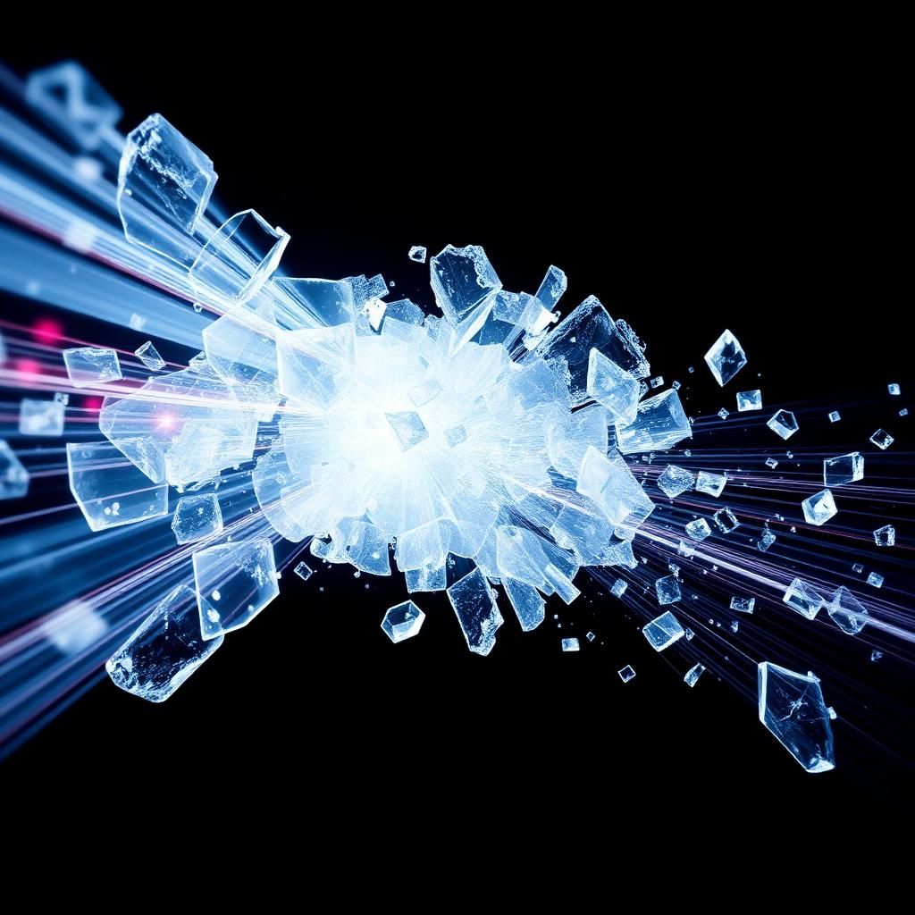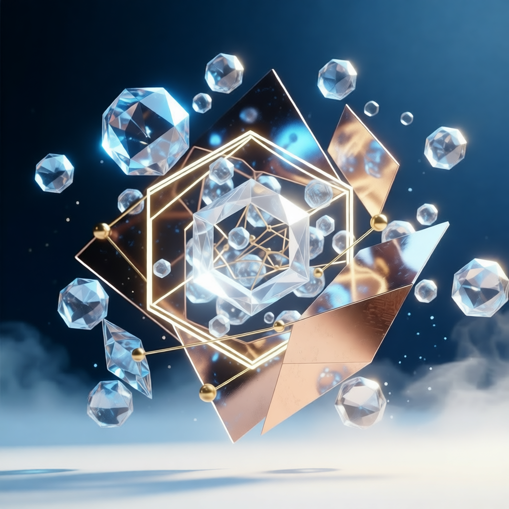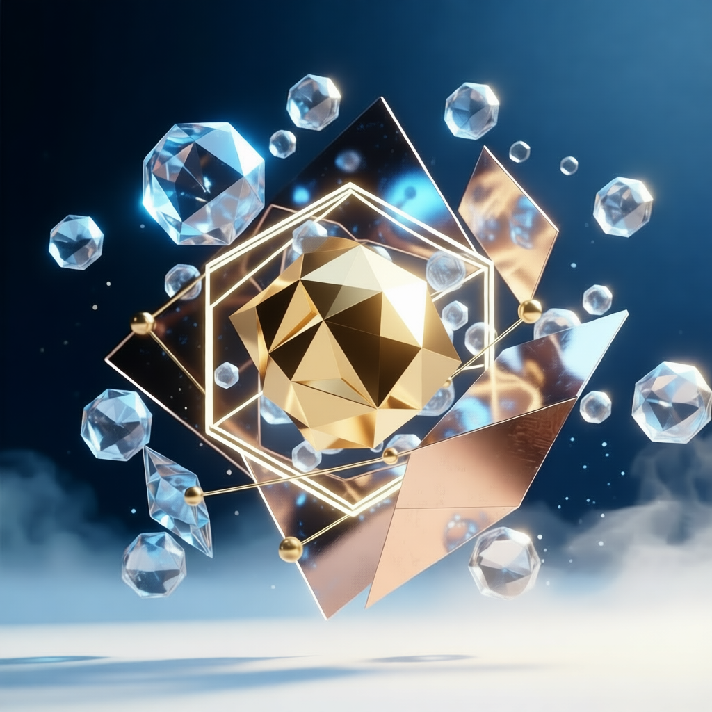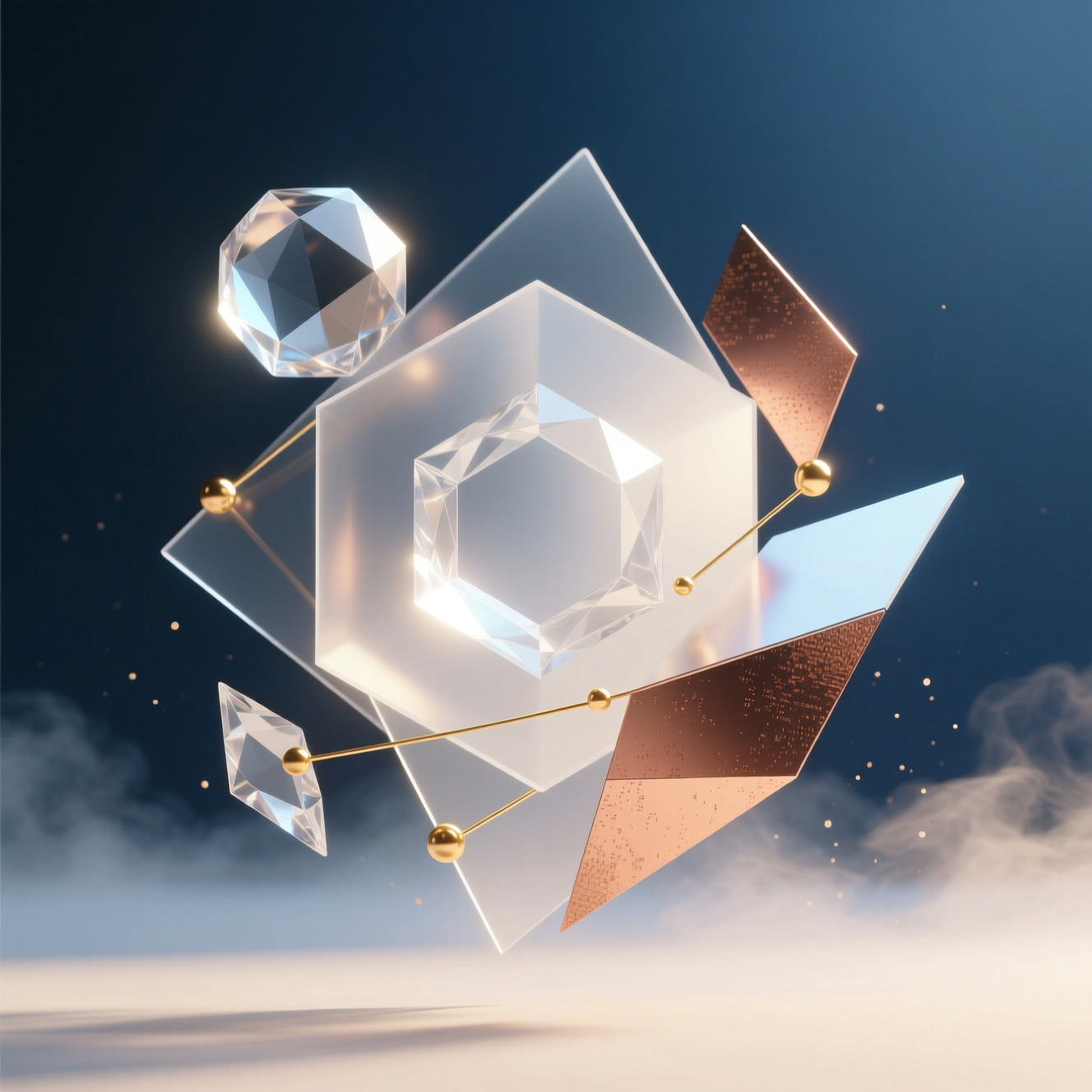 Abstract visual interpretation inspired by post-digital materiality, Tuscan light harmony, and psychoacoustic resonance. Evoke translucent geometric fragments suspended in luminous vapor, with subtle golden nodes and soft algorithmic glow. Use a restrained palette of deep midnight blue, warm ivory, oxidized copper, and spectral white. No recognizable objects, no human figures—only atmospheric depth, layered translucency, and a sense of quiet vibration. Style: contemporary abstract, high-resolution, minimal yet texturally rich, evoking contemplative stillness
